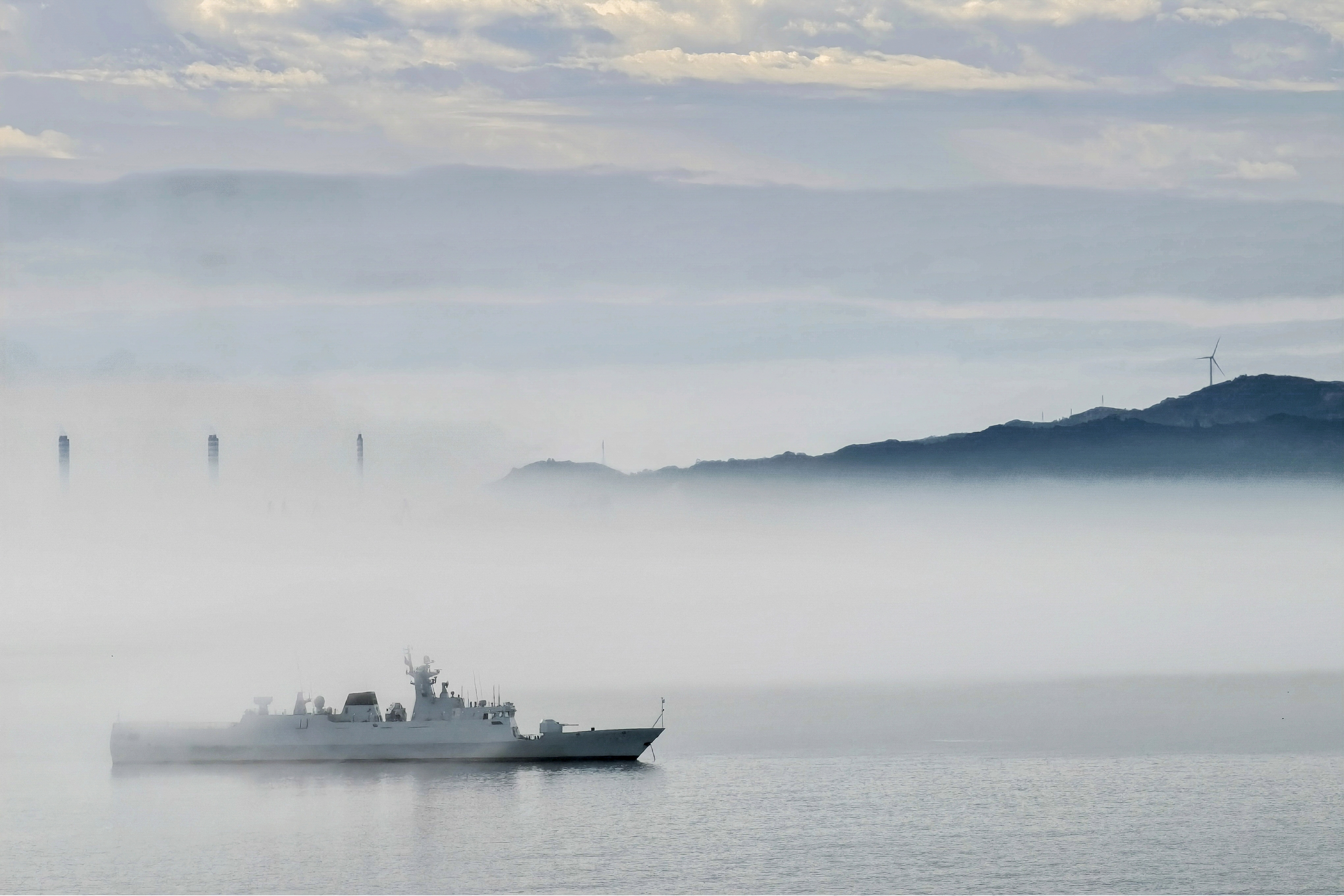 2025年3月3日摄于厦门鼓浪屿,一艘军舰被薄雾轻柔环绕,在朦胧雾气中更显庄重威严,似在默默守护这片海域。(注:为保密起见,军舰弦号隐去)