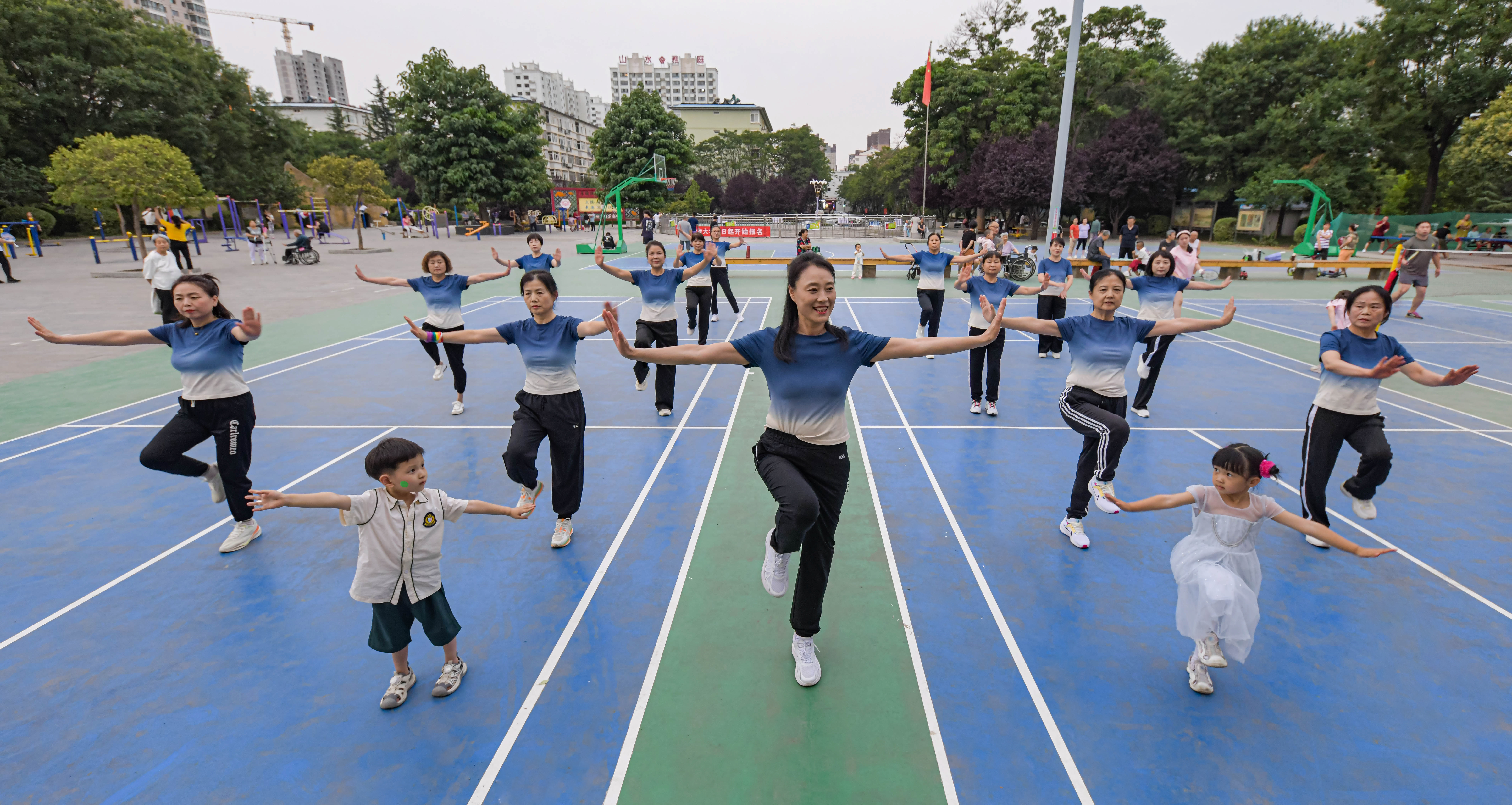 2025年6月24日晚安,在铜川市新区秦岭小区文化广场,两个天真可爱的小孩子认真模仿大人的动作跳韵律操。