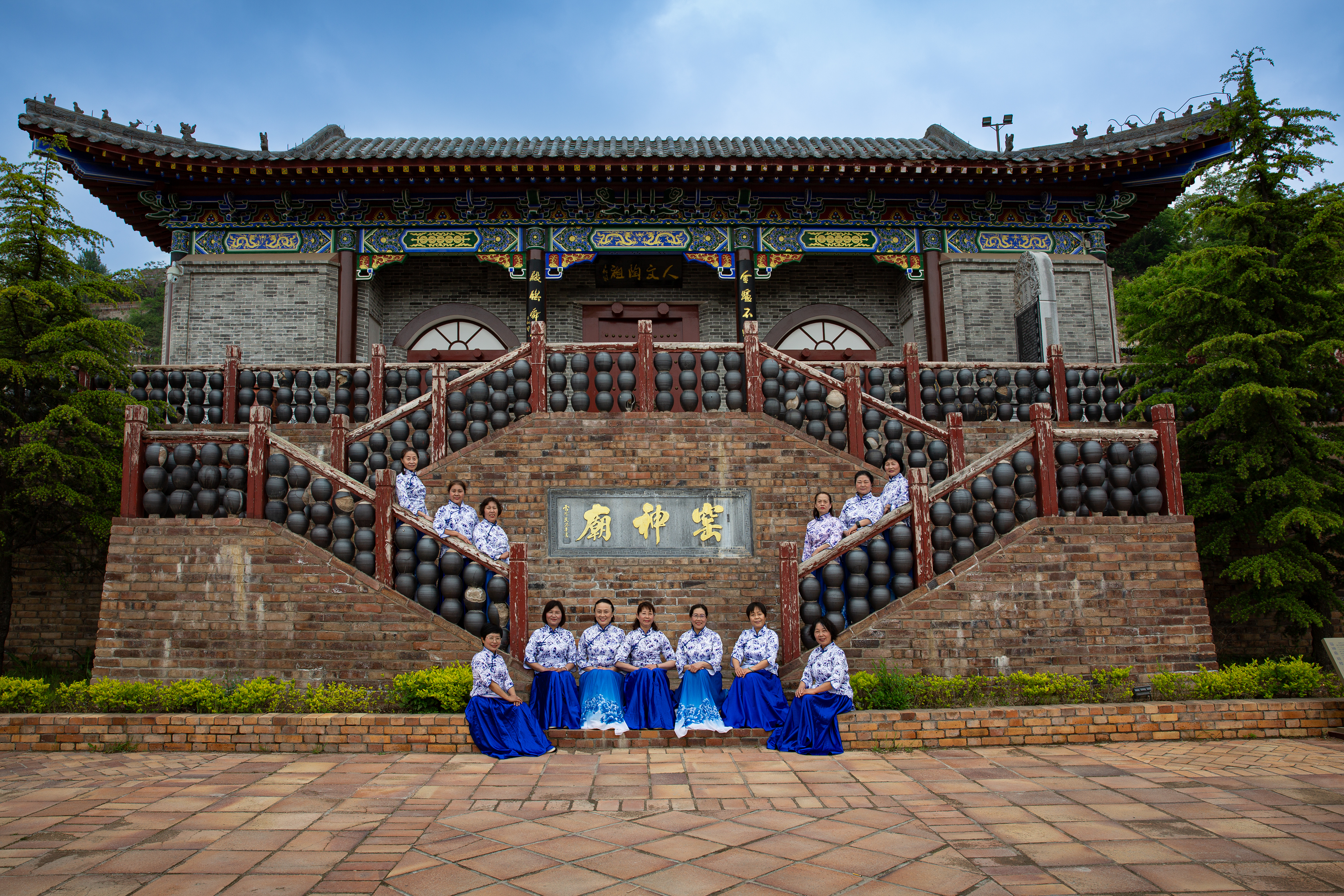 身着青花瓷服饰的模特立于陈炉古镇瓷神庙前,传统纹样与千年窑火遗迹形成时空对话。服饰与环境的呼应:模特青花瓷裙与黑色陶罐墙和神庙建筑工艺遥相呼应,传统与现代、器物与人文在此刻交融,形成极具东方美学张力的视觉。