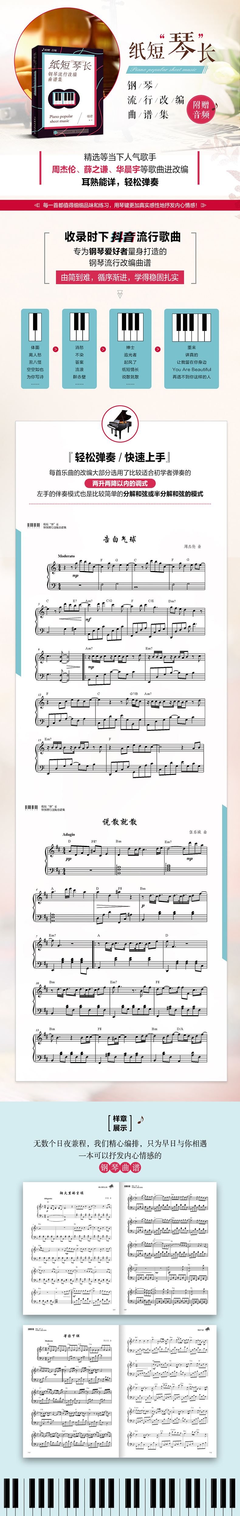 本书是为钢琴爱好者量身打造的钢琴流行改编曲谱,作者在原曲优美动听的基础上,进行钢琴改编。 书中包含40余首钢琴曲谱,每首乐曲都是时下流行的歌曲。每首乐曲改编都标记有详细的指法、感情层次、轻重强弱等。每一首都值得细细品味和练习。用琴键更加真实感性地抒发内心情感。 本书适合钢琴爱好者阅读,也适合音乐培训学校作为练习教材使用。