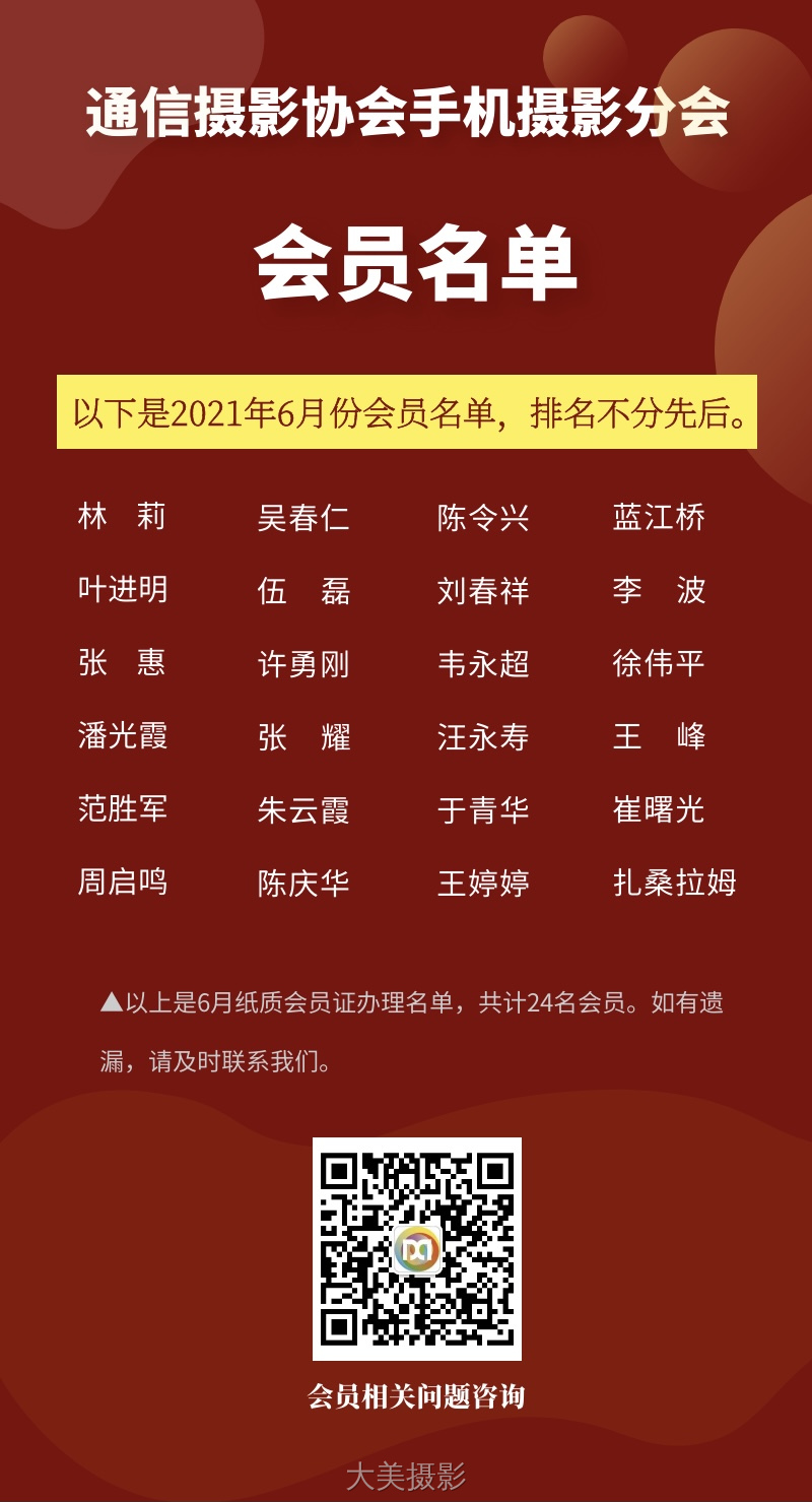 通信摄影协会手机摄影分会是通信摄影协会下属分支机构,是广大手机摄影爱好者组成的摄影社团组织。现对2021年6月批准加入“通信摄影协会手机摄影分会”的会员名单进行公布: