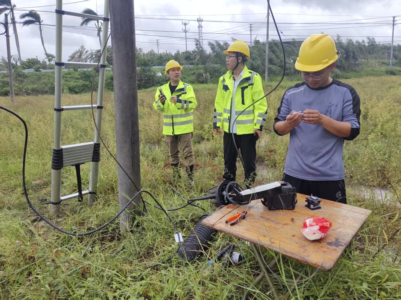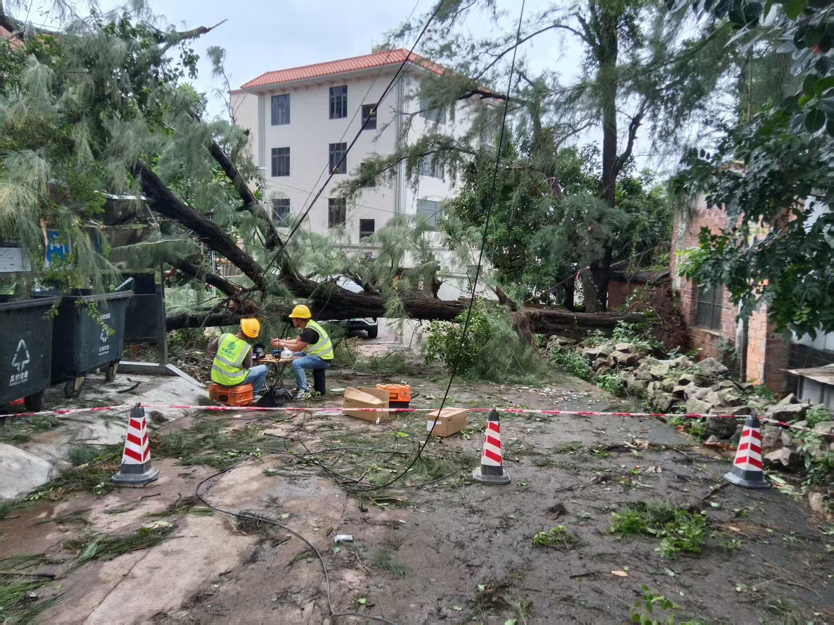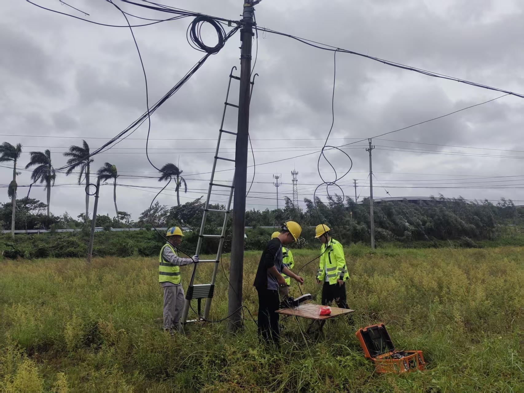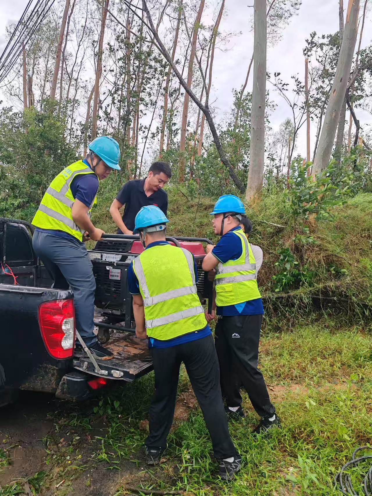 素材描述:正值假期,台风“麦德姆”过境,且叠加近期已遭受多次台风袭击情,部分区域通信网络稳定运行面临严峻挑战。战风雨、保畅通,中国移动广东公司多支应急保障队伍赶赴一线、昼夜奋战,抢修受损基站和光缆,全力以赴抢通通信网络。