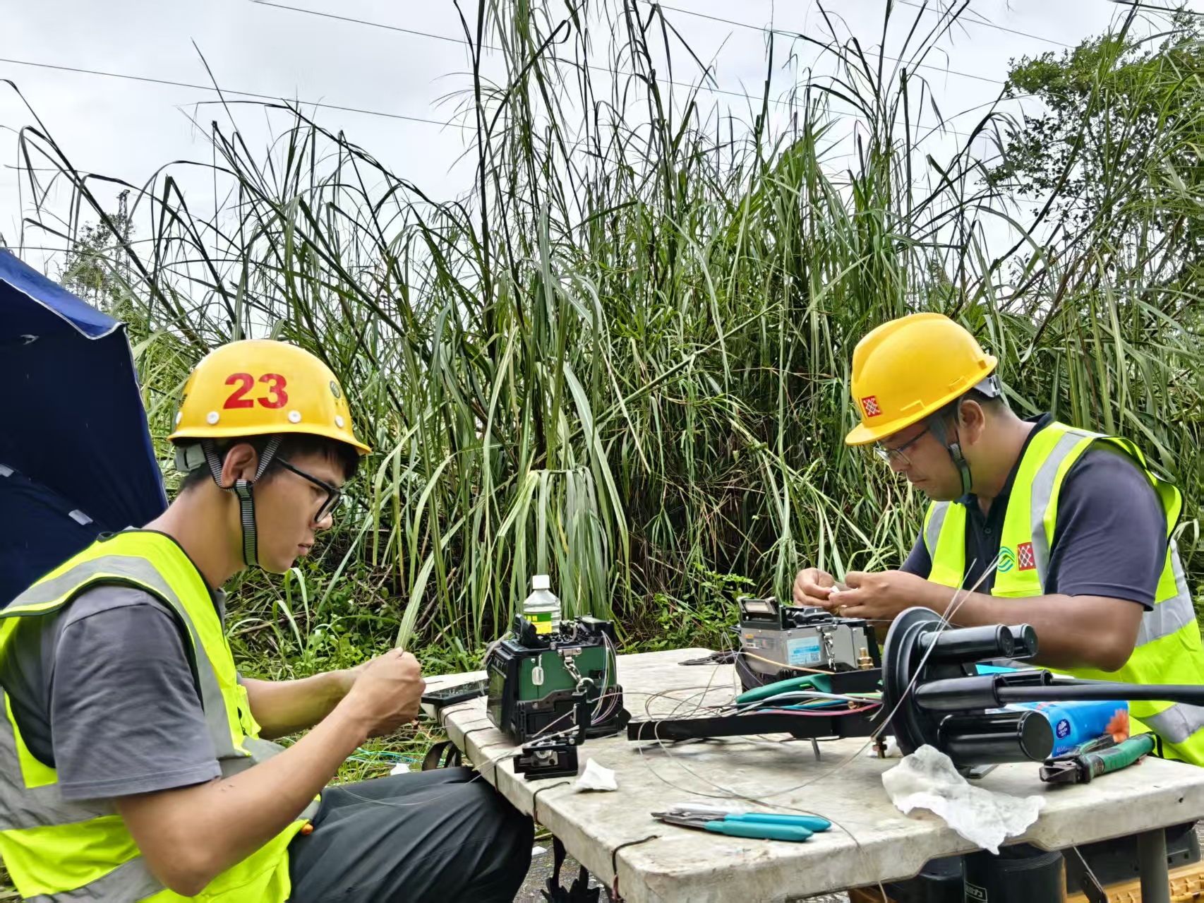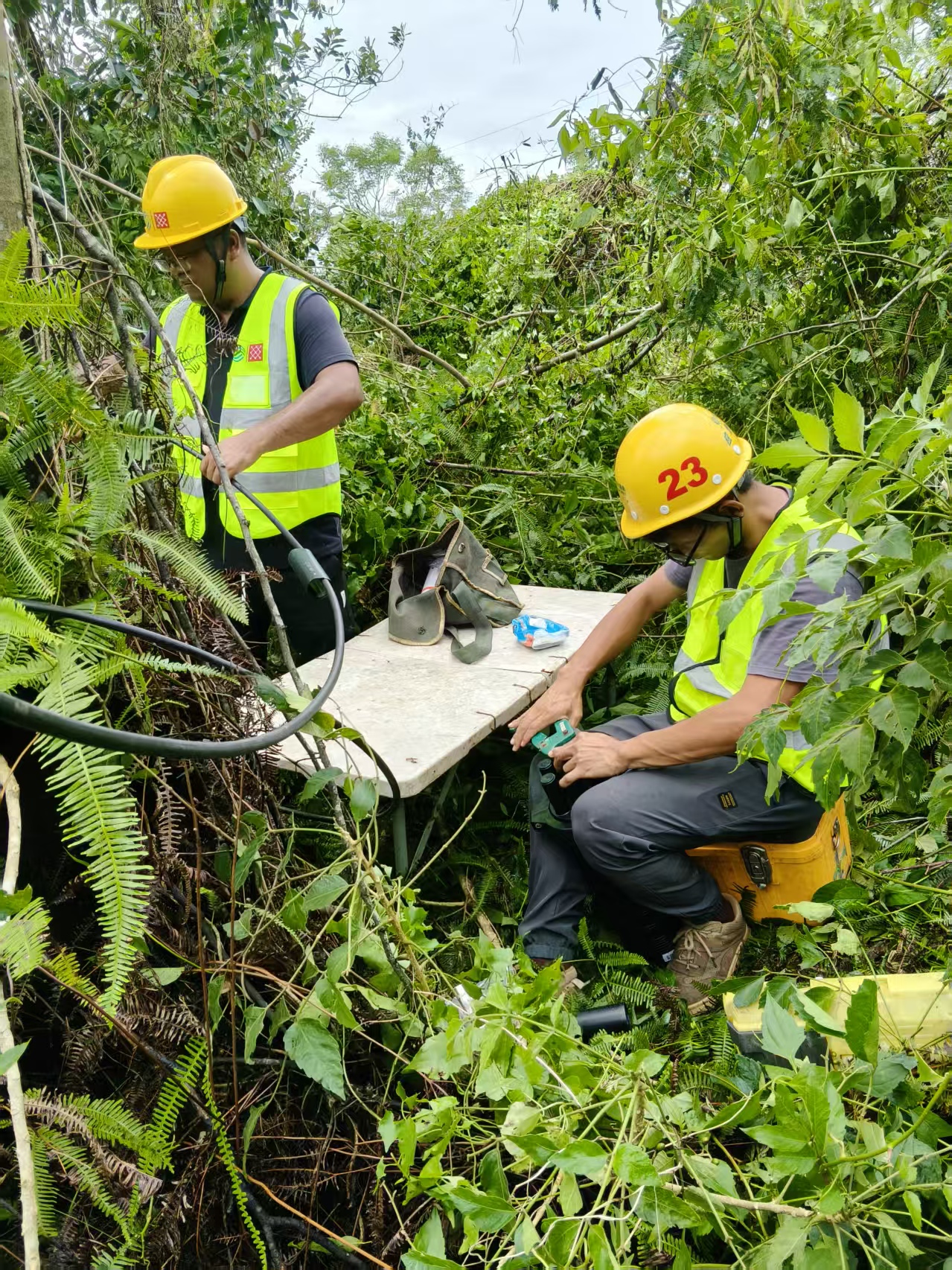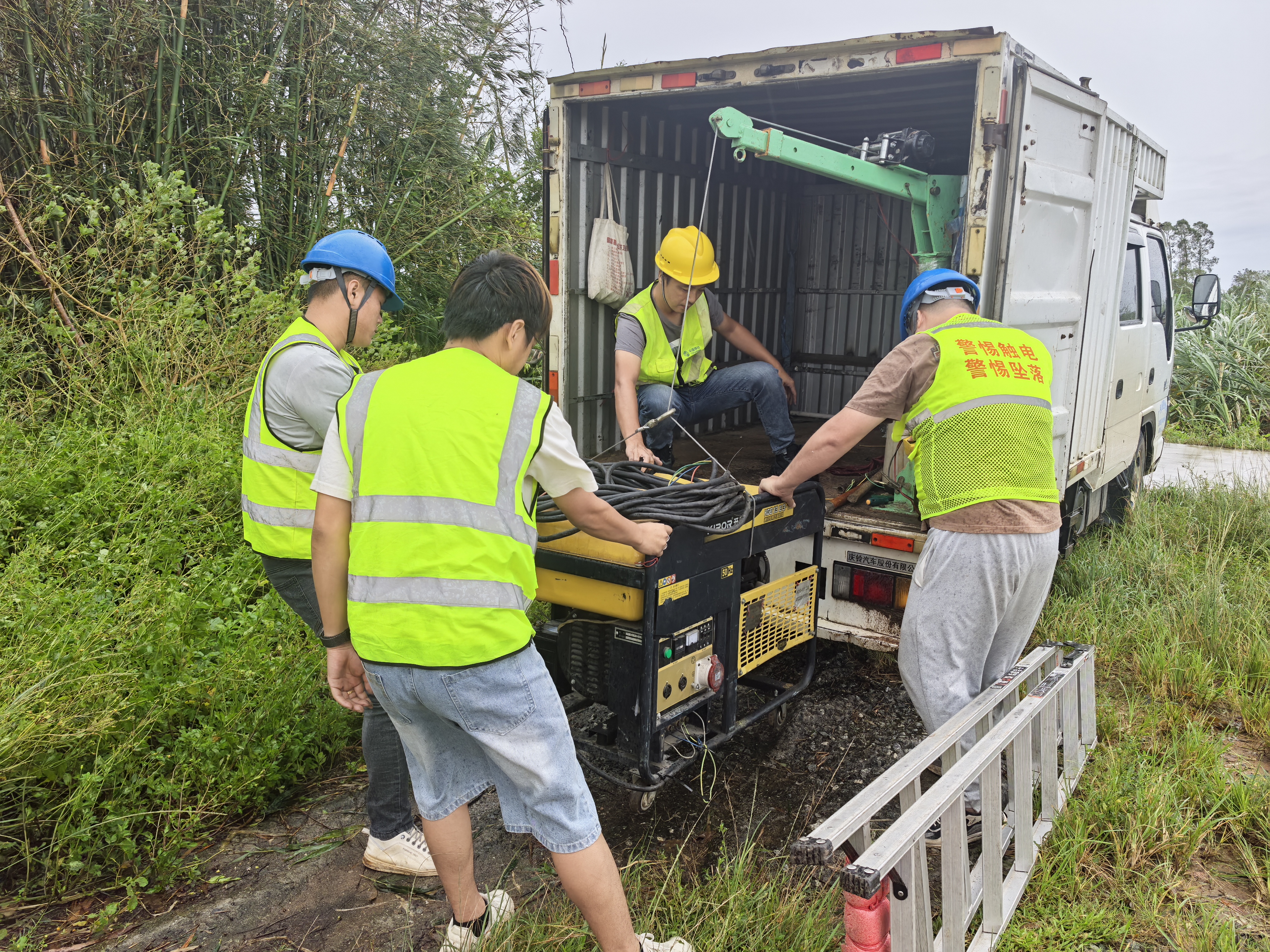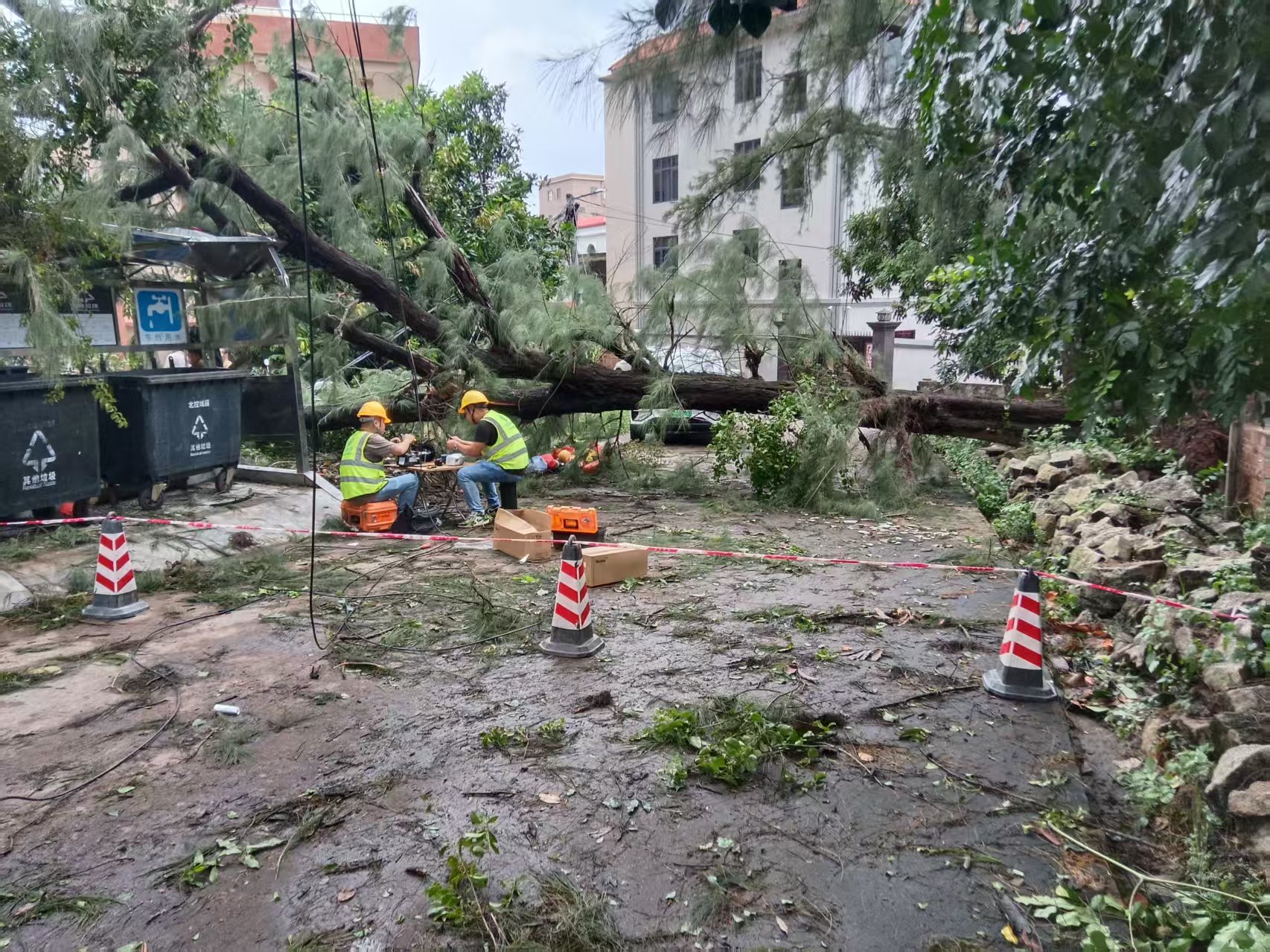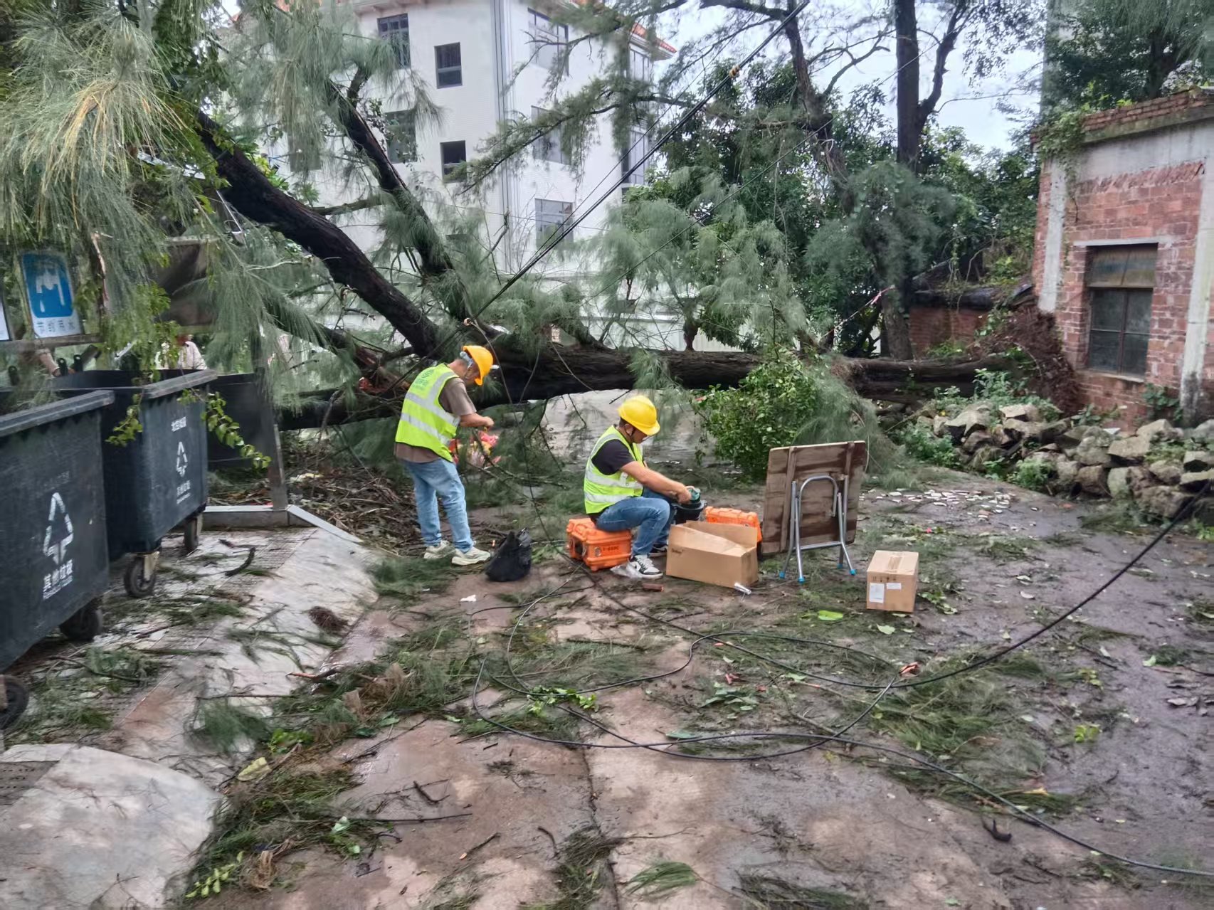 素材描述:正值假期,台风“麦德姆”过境,且叠加近期已遭受多次台风袭击情,部分区域通信网络稳定运行面临严峻挑战。战风雨、保畅通,中国移动广东公司多支应急保障队伍赶赴一线、昼夜奋战,抢修受损基站和光缆,全力以赴抢通通信网络。