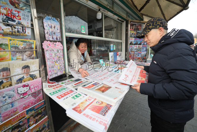素材描述:2025年全国两会召开以来,各地邮政全力以赴做好党报党刊投递工作,确保两会精神及时传递到基层。北京市邮政分公司精心组织,报刊发行局成立服务专班,设立分发专区,严控各环节时限;员工提前到岗,每日加密投递频次;开辟“专人专车、随到随送”绿色通道,实现重点区域报刊亭“当日见报率”达100%。图为北京西城区广安门外大街报刊亭“两会专架”前,市民一大早就来驻足翻阅、购买最新的刊载有两会报道的《人民日报》等报纸。