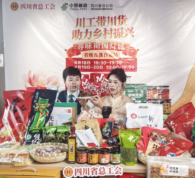 素材描述:4月20日,由四川省总工会、四川省邮政分公司主办,自贡市总工会协办,自贡市邮政分公司承办的“川工带川货 助力乡村振兴——寻味南国灯城”省级直播活动圆满收官。活动期间,直播点赞量突破3万次,带货额突破52万元。为了让消费者第一时间收到直播间下单的商品,自贡市分公司充分发挥邮政网络优势,积极做好配送服务,让消费者享受“云端”下单、家门口收货的优质用邮体验。