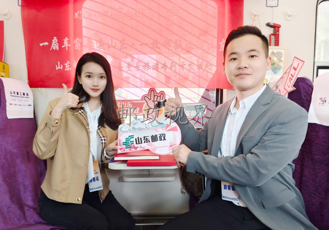 素材描述:4月10日,“好客山东·齐鲁1号”旅游专列首发。山东省济南市邮政分公司以“一扇车窗看遍山东、一枚邮戳收藏山东”为主题,在车内设置文创展区,展出40余款融合山东文旅特色的集邮文创产品,吸引了参加首发活动的山东省有关部门领导驻足参观并给予高度评价。 该专列行进中,山东邮政还通过抖音直播,实时播报列车行程,展示邮政与中铁文旅联合推出的专属纪念明信片等文创产品,吸引了大量观众参与互动。 图为邮政主播在展示相关文创产品。
