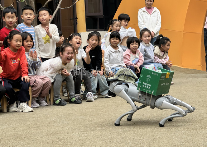 素材描述:近日,河南省周口市邮政分公司在市直幼儿园、莲花路幼儿园等地举办了以“科技邮趣·萌宠同行”为主题的巡研学活动,通过“仿生机器狗+邮文化”带来的科技魅力,为小朋友开启了一场AI奇幻邮递之旅。小朋友通过“小小邮递员”“小小银行家”等角色扮演,与机器狗互动,体验送报、送信、送快递,学习认识钱币等知识。现场还设立了集邮文创产品、幼儿画报图书展示区,吸引了众多师生前来打卡。图为“邮小驿”机器狗一出场就获得小朋友喝彩。